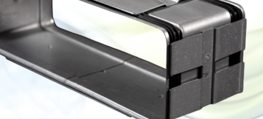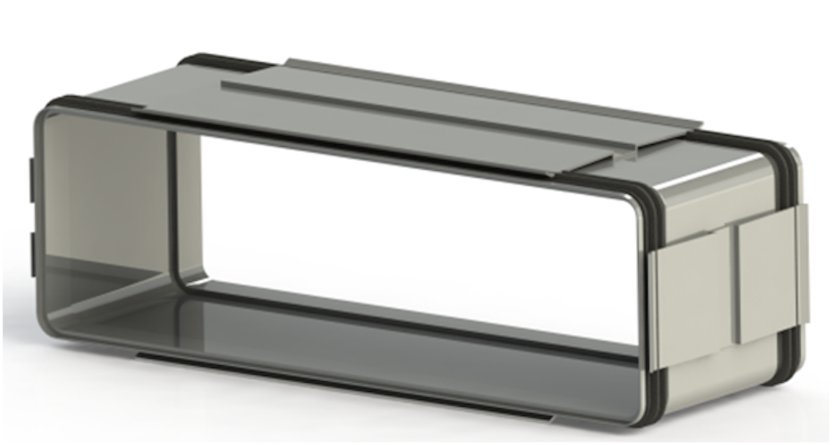Соединитель изготовлен из оцинкованной листовой стали с уплотнением из этиленпропиленового каучука. Он имеет манжетное уплотнение и крепежный зажим для фиксации разъемов
